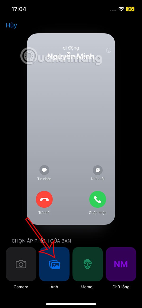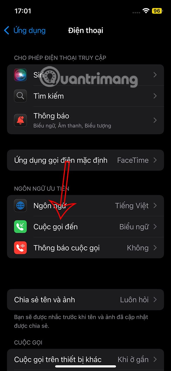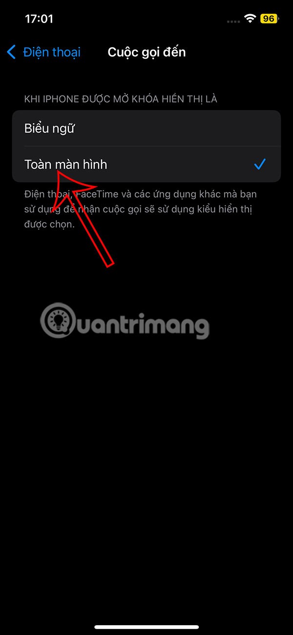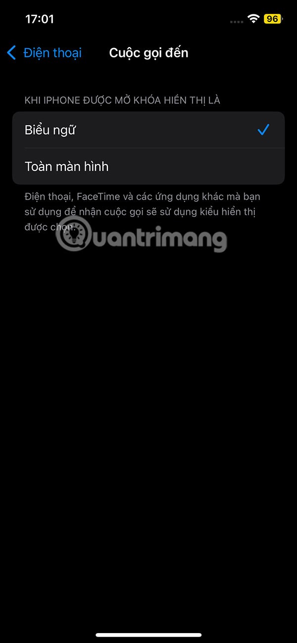 แสดงอินเทอร์เฟซการตั้งค่าสำหรับแอปพลิเคชั่นโทรศัพท์บน iPhone โดยแตะที่สายเรียก เข้า เพื่อปรับแต่ง จากนั้นผู้ใช้จะเห็นค่าเริ่มต้นในโหมดแบนเนอร์ เราจะคลิกที่โหมดเต็มหน้าจอ